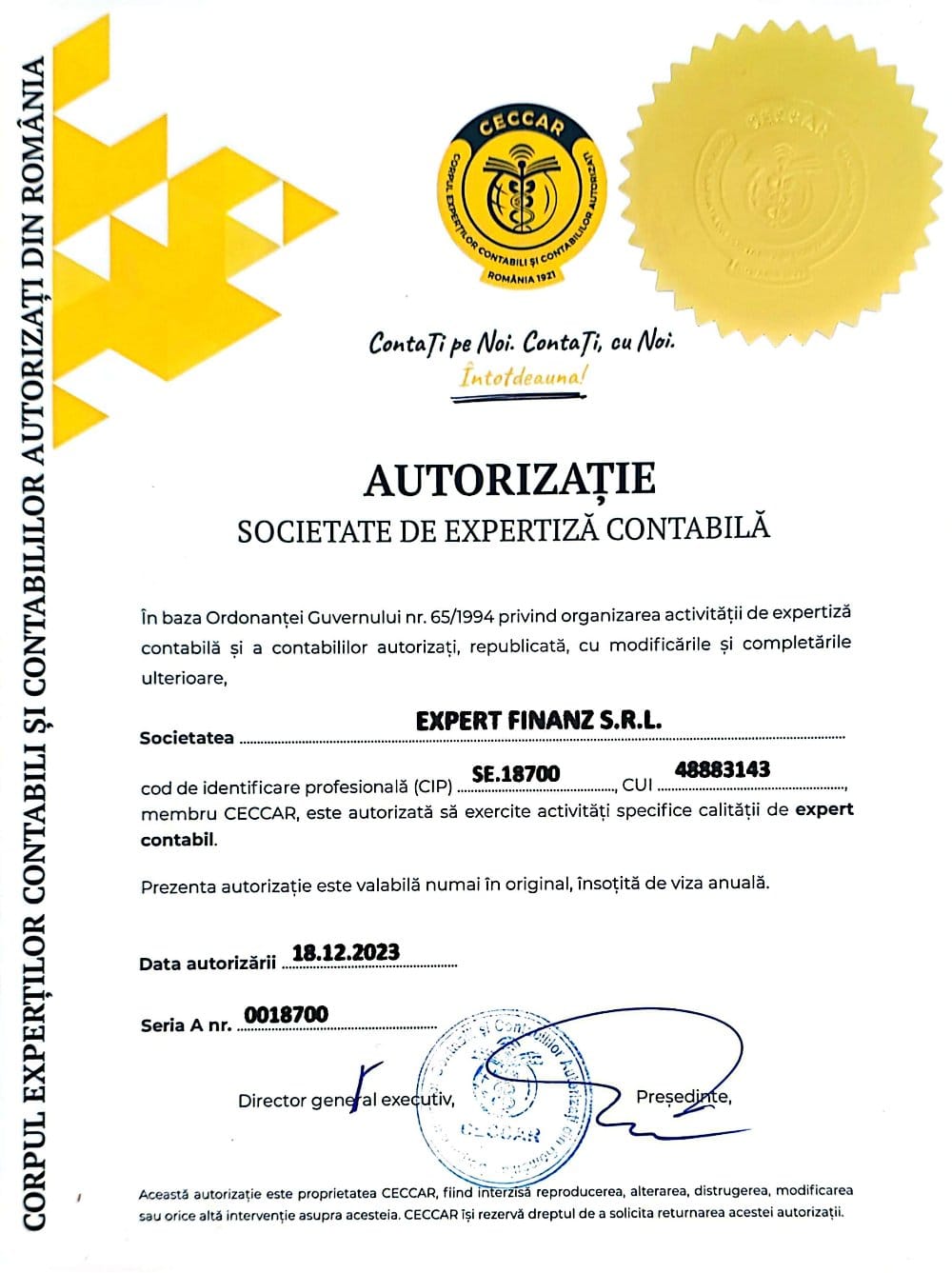 Firma Expert Finanz, având ca fondator pe Adina Chiosa — expert contabil Timișoara, autorizat CECCAR Timiș (nr. matricol 54270), absolventă a Facultății de Economie și Administrare a Afacerilor din cadrul UVT și a Masterului de Expertiză Contabilă și Evaluarea Afacerilor — este societate de expertiză contabilă autorizată CECCAR (CIP SE.18700), înregistrată la ONRC cu cod CAEN 6920 Rev. 3.